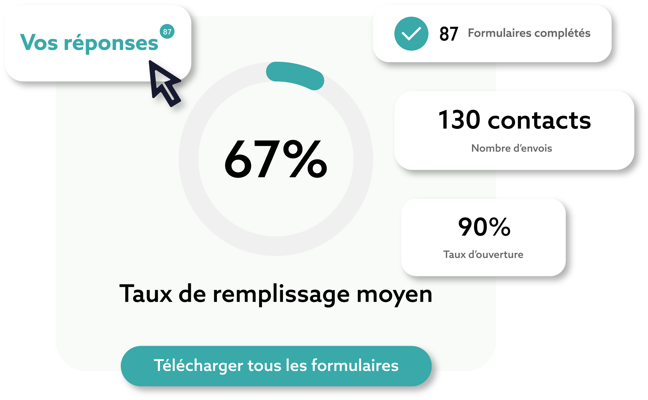 Suivez les performances de vos formulaires, relancez facilement les clients qui n’auraient pas complété leur formulaire à 100 %, exportez les réponses en un clin d’oeil au format PDF ou CSV pour améliorer vos processus et interactions clients !
